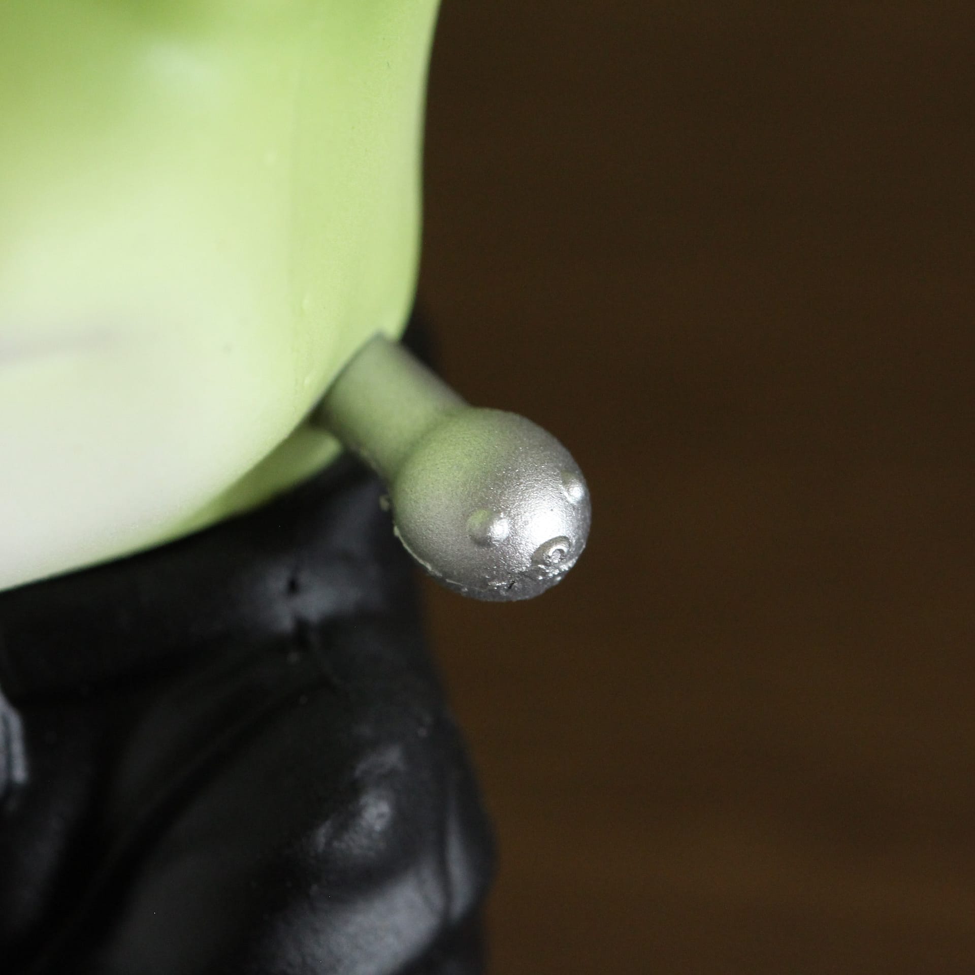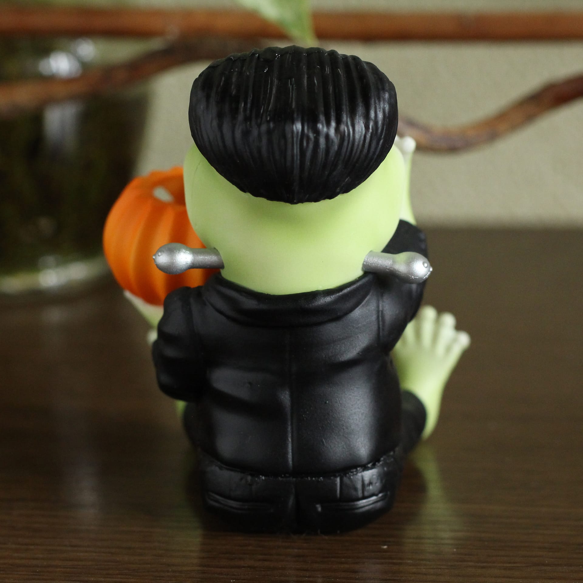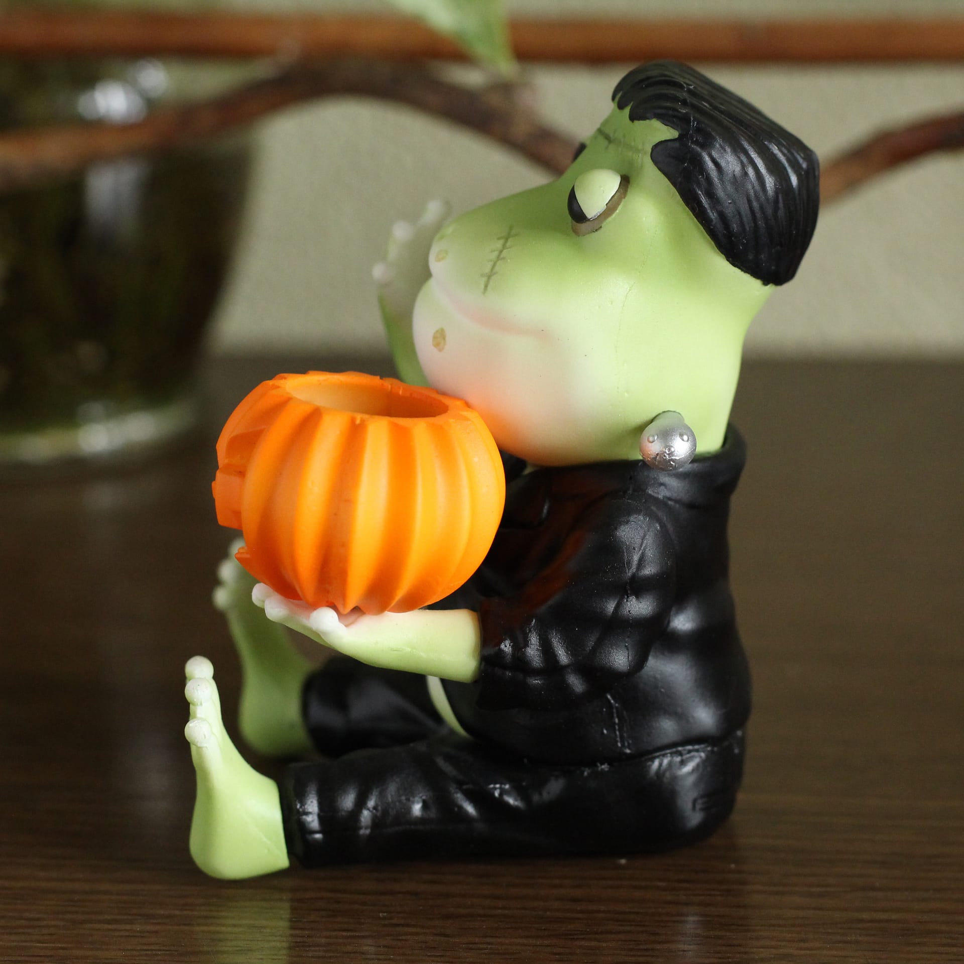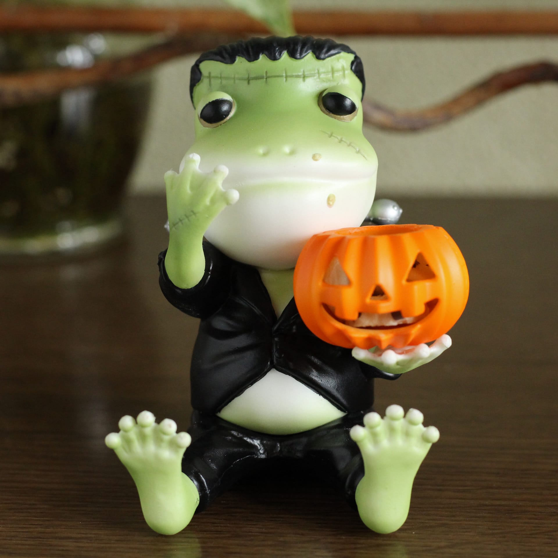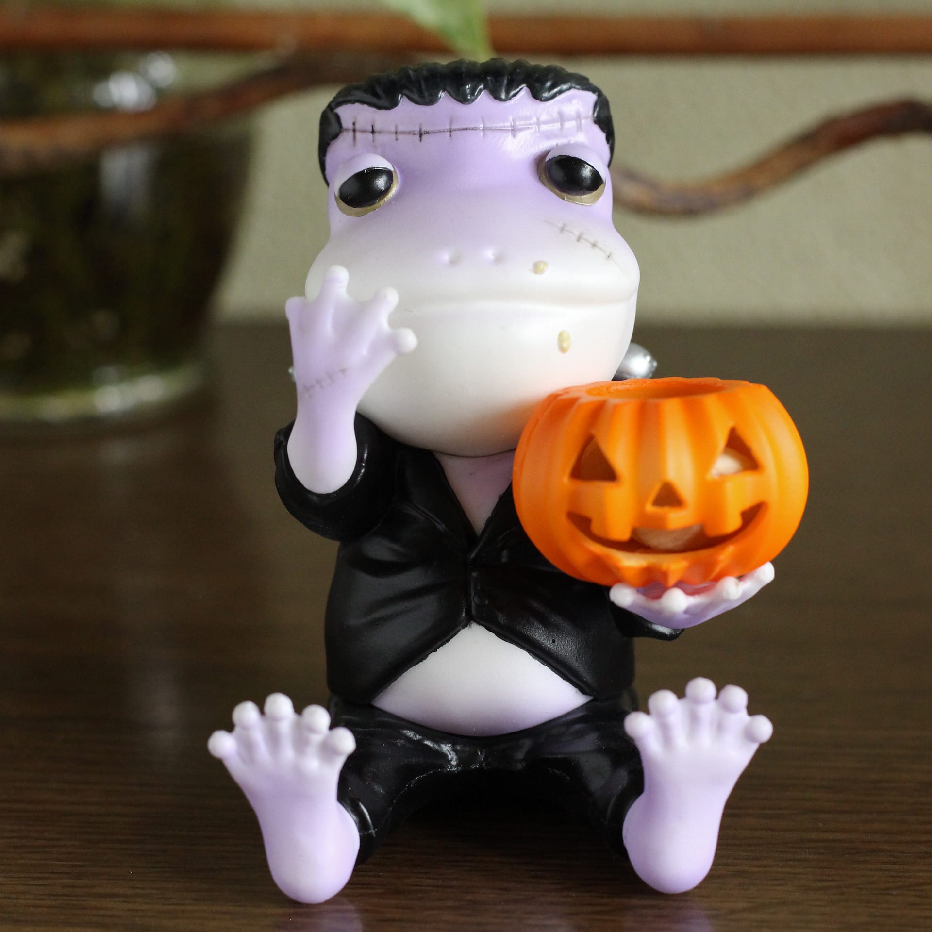 フランケンシュタインに化けたカエルです。ハロウィンの季節に側に置いておくと、パンプキンの入れ物がお菓子で満たされるかもしれない縁起の良い置物です。