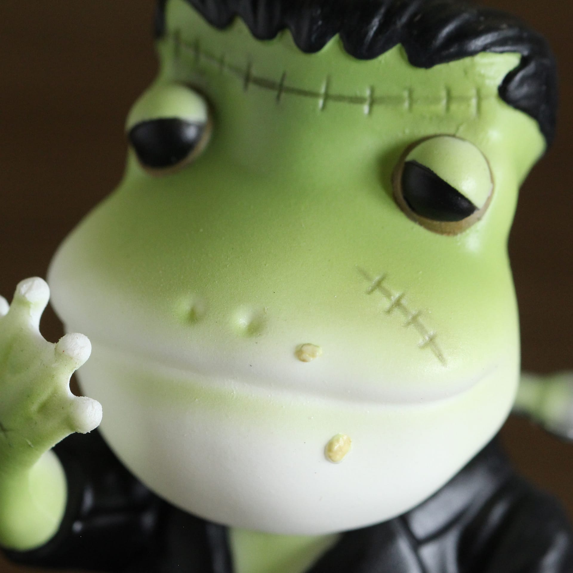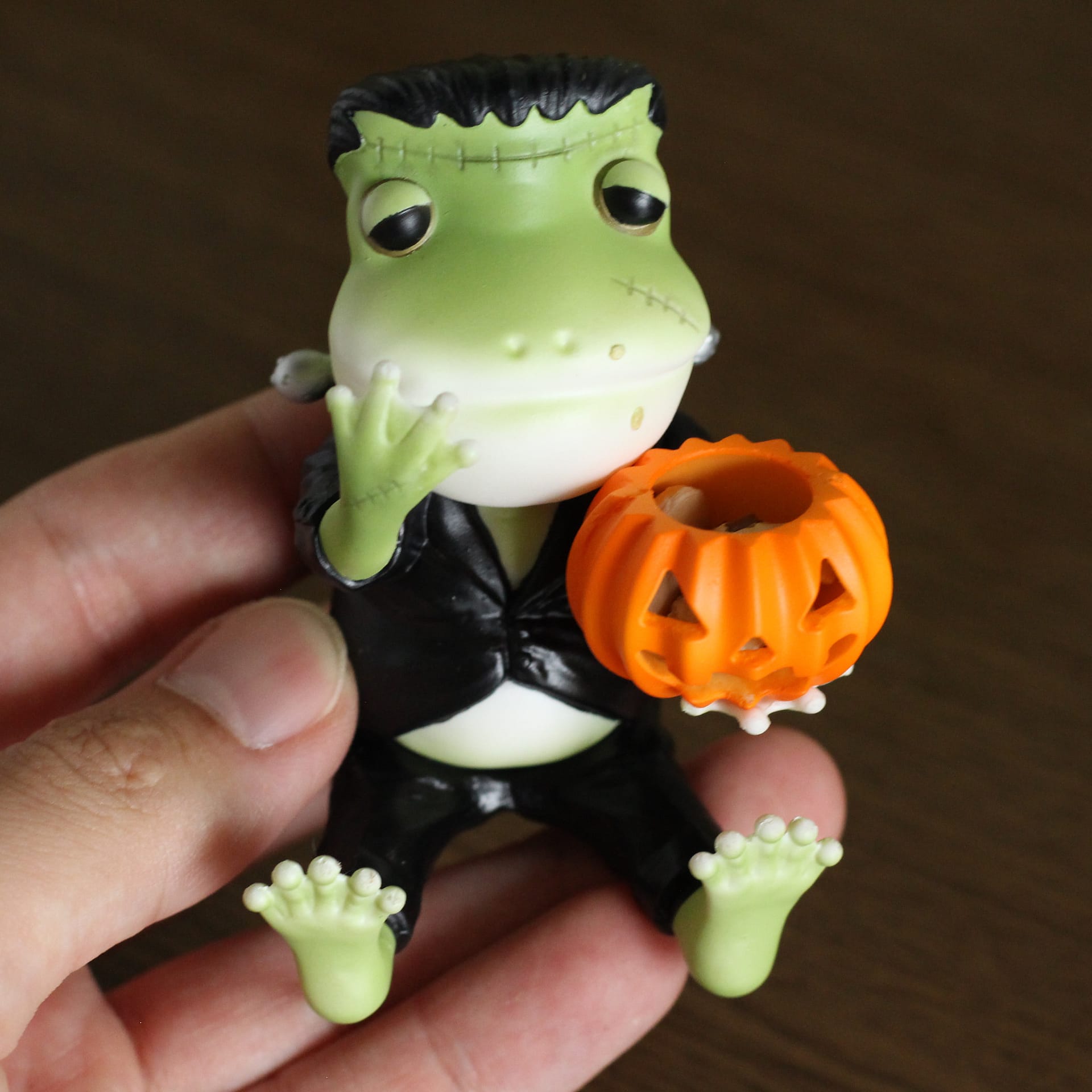 フランケンシュタインに化けたカエルです。ハロウィンの季節に側に置いておくと、パンプキンの入れ物がお菓子で満たされるかもしれない縁起の良い置物です。