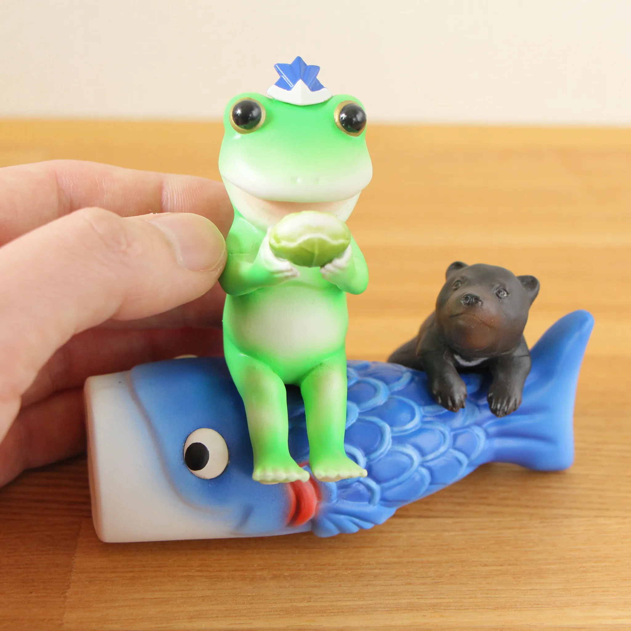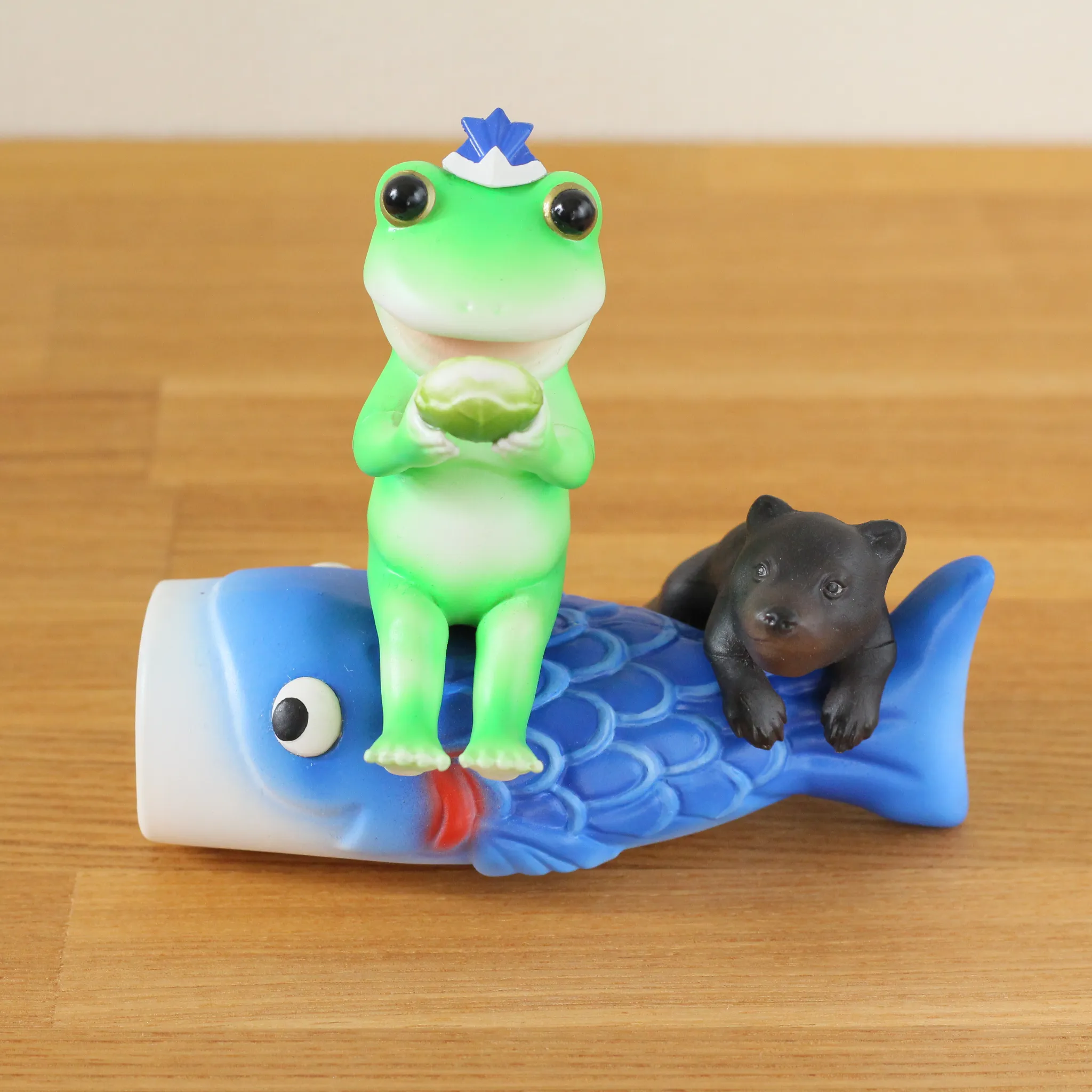 端午の節句で鯉のぼりに座って柏餅を食べようとしていたらこぐまに見つかってしまったカエル【緑と青】