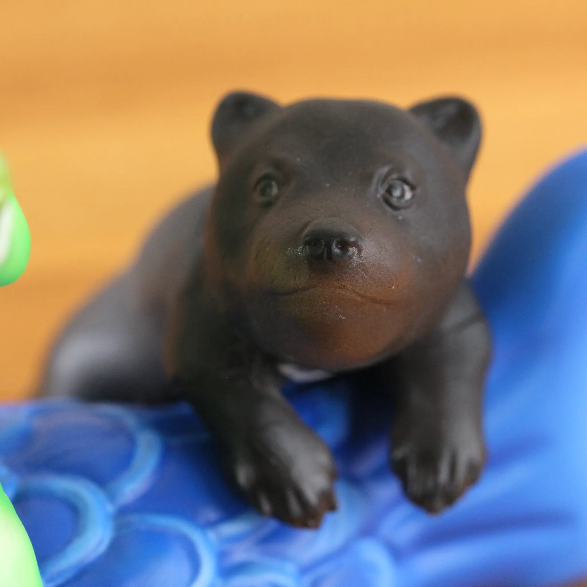 柏餅を食べるカエルをじっと見つめるこぐま。