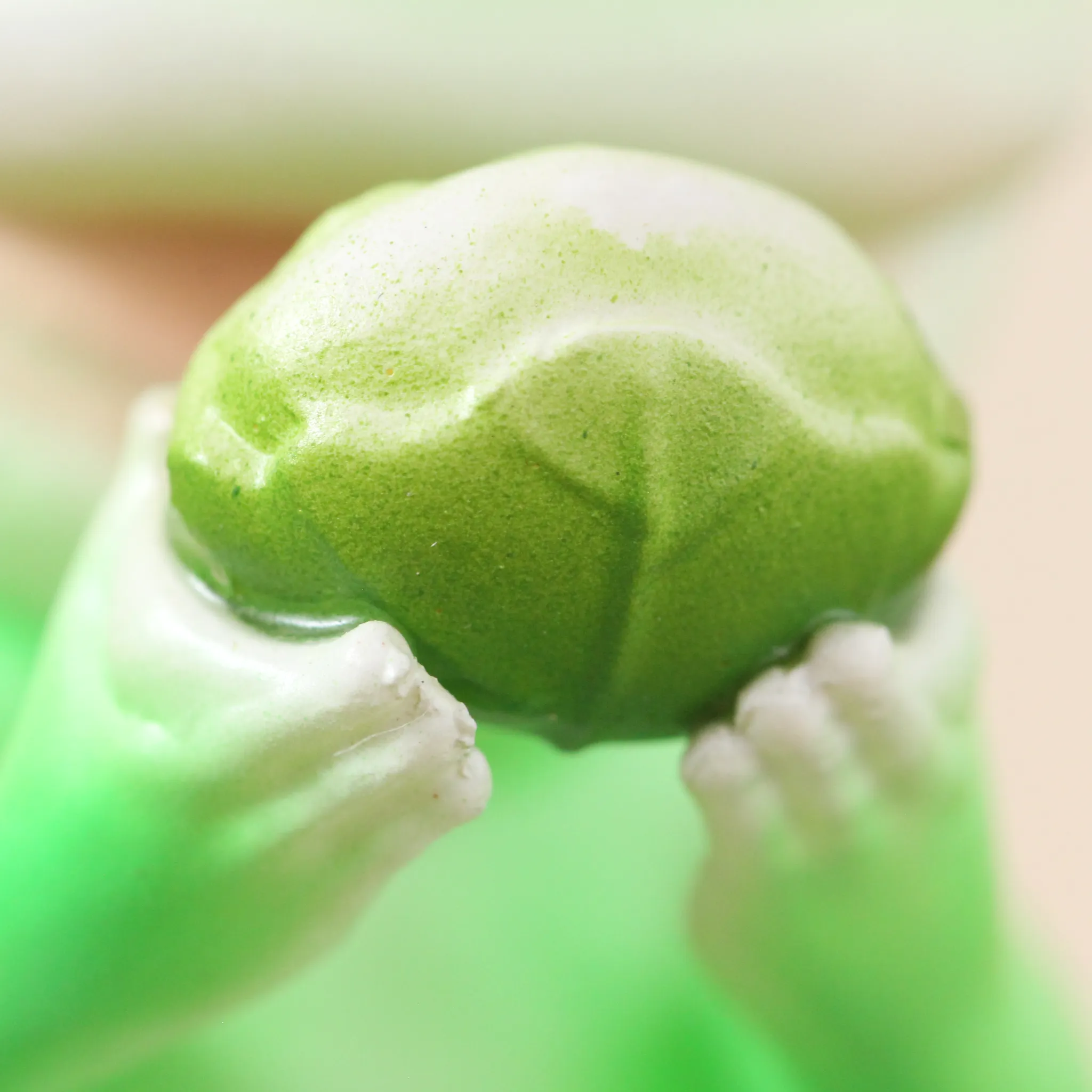 小さく精巧な折り紙の兜を被ったカエル。
